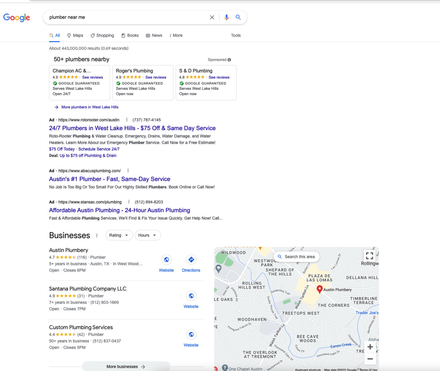 For example, here is a search result for the search “Plumber near me” in Austin, Texas: