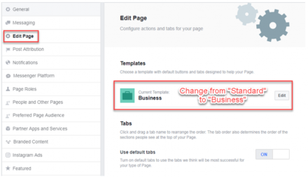 When you go into your settings, click on edit page tab and change the template from standard to business. This adds a tailored suite of available tabs. You can add or delete tabs, but this is a better starting point for a business page.