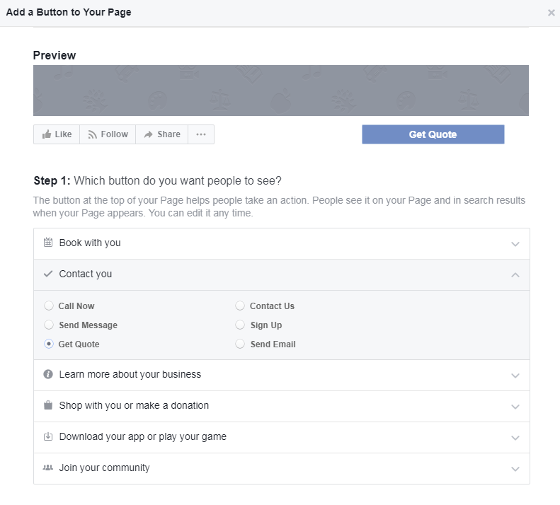 You set this up by editing the contact button at the top right under the cover image. For example, if you are a contractor, you might want to have people request a quote: